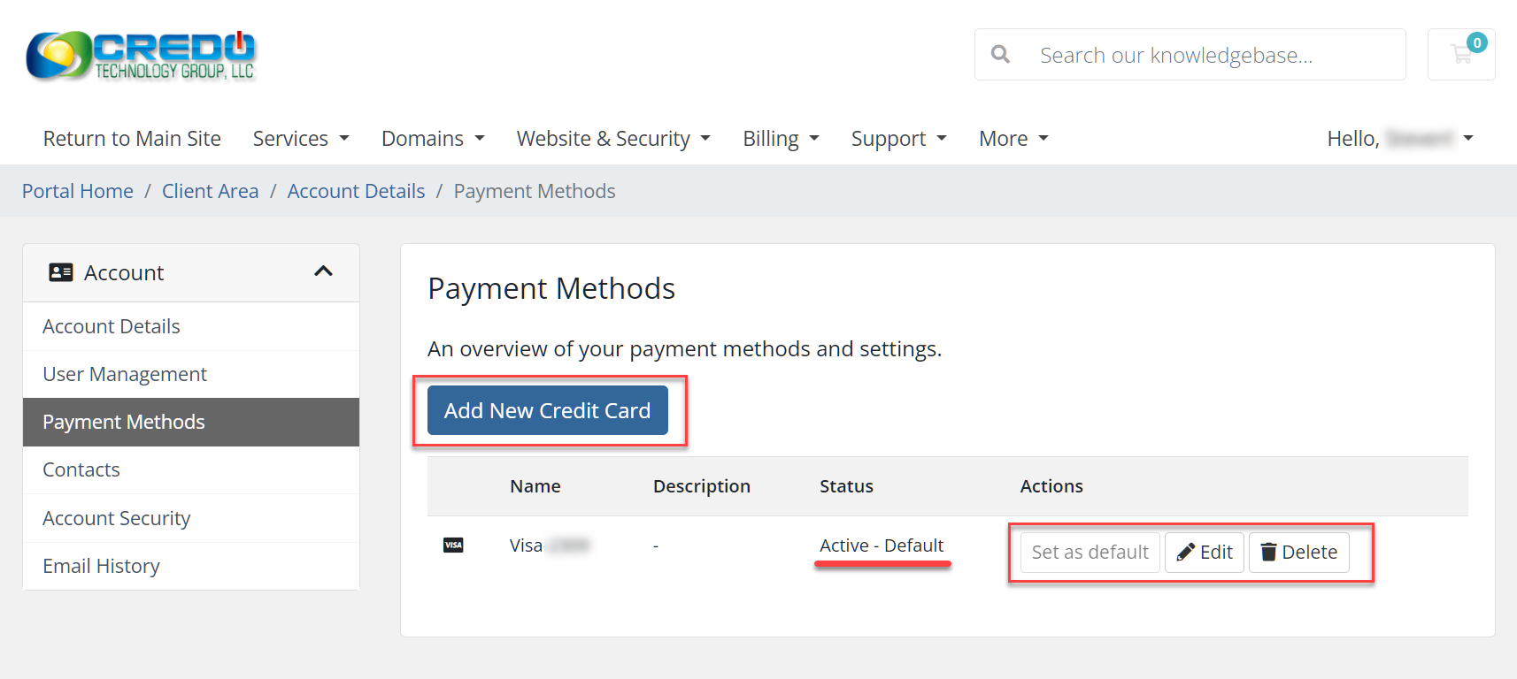 2. From there you can add a new payment method and edit existing payments by clicking Add New Credit Card or if you have a Credit Card already listed you can click on Set as default, Edit, or Delete