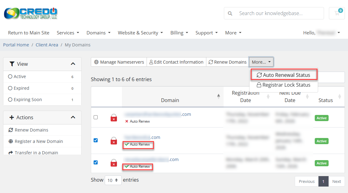 If you want to do more than one at once you can select the domains you want to cycle Auto Renew on or off and click the Auto Renewal Status. It will make Auto Renews flip. Auto renews that are off to turn on and auto renews that are on to turn off.